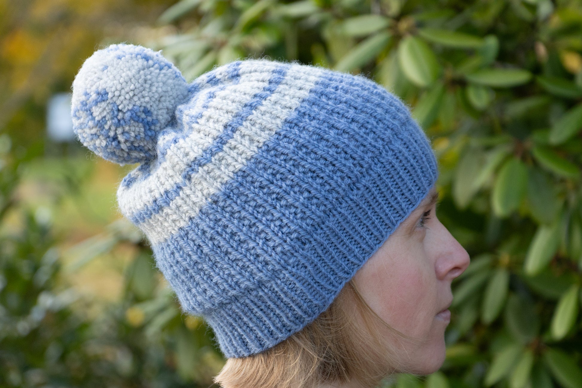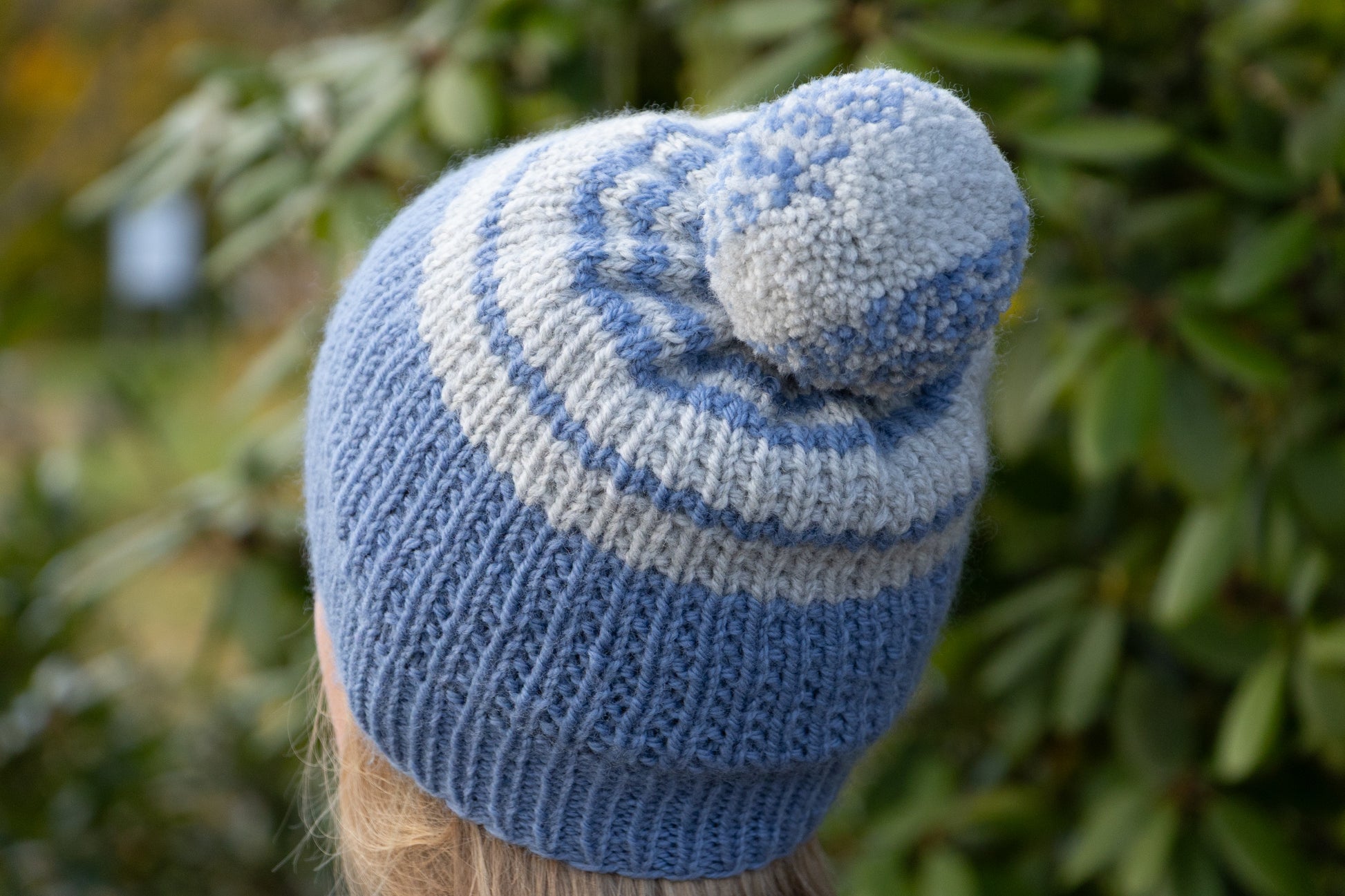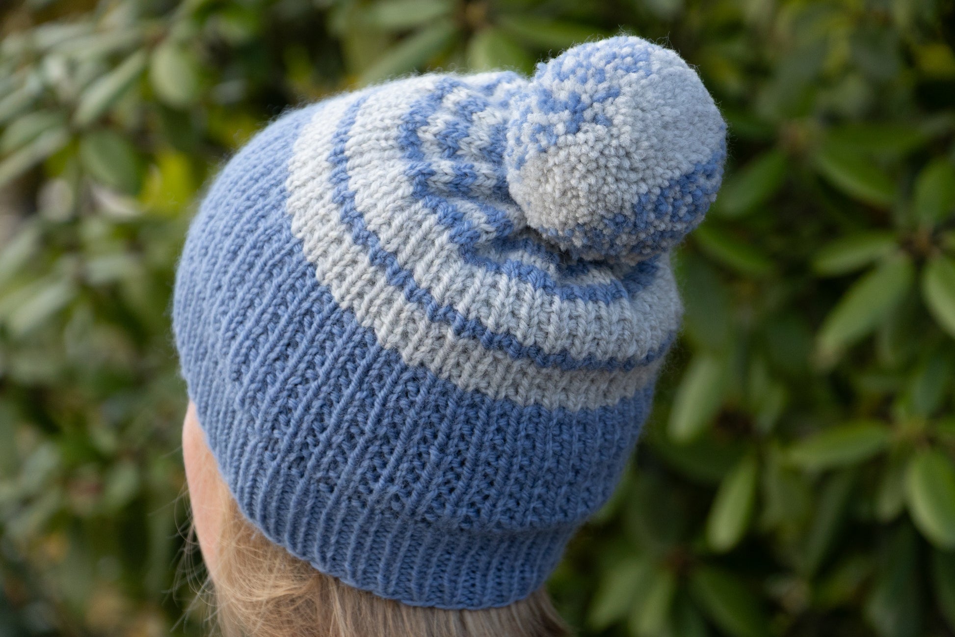 Mit Liebe gestrickte hellblau-graue Bommelmütze aus Schurwolle.