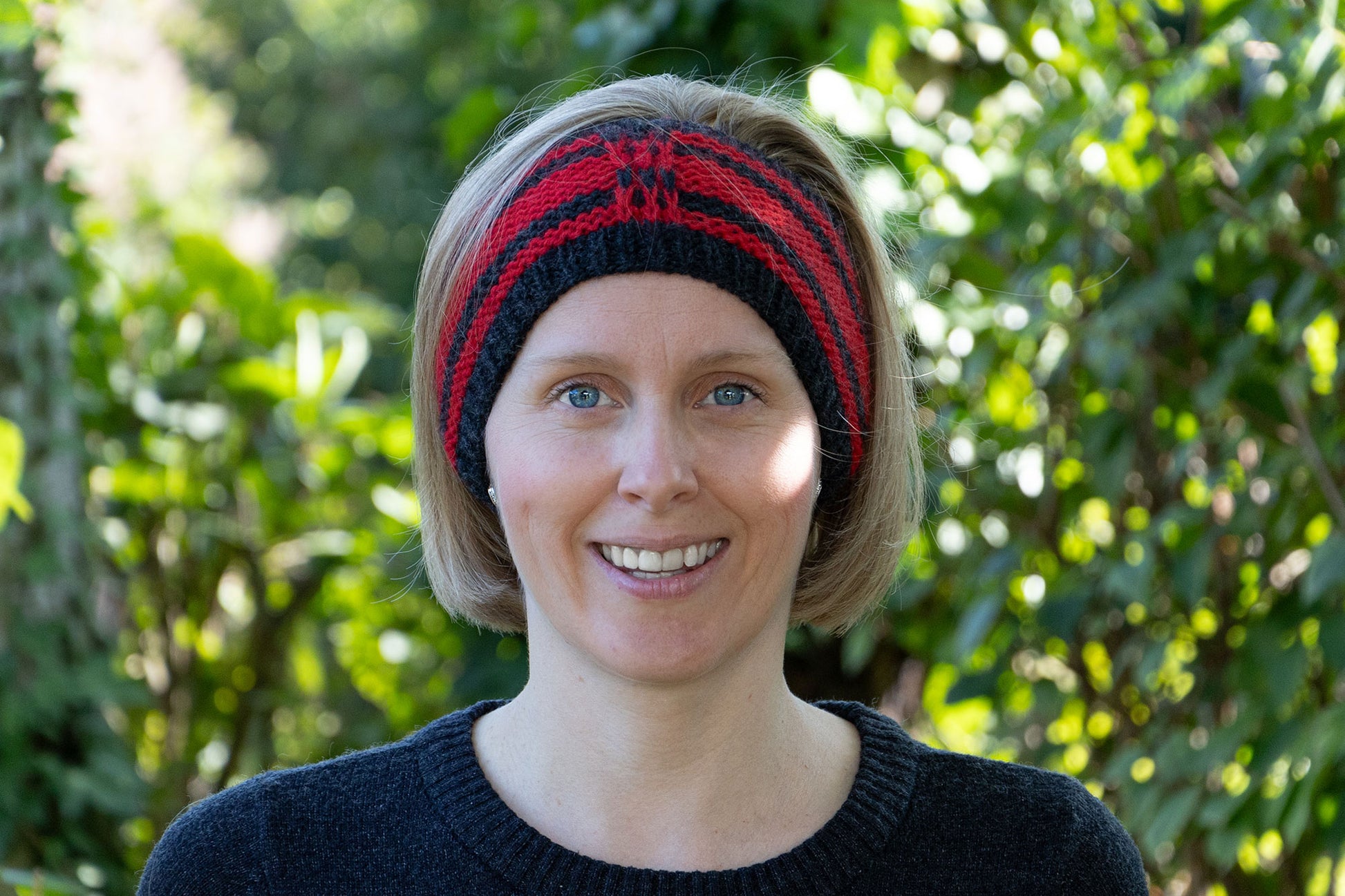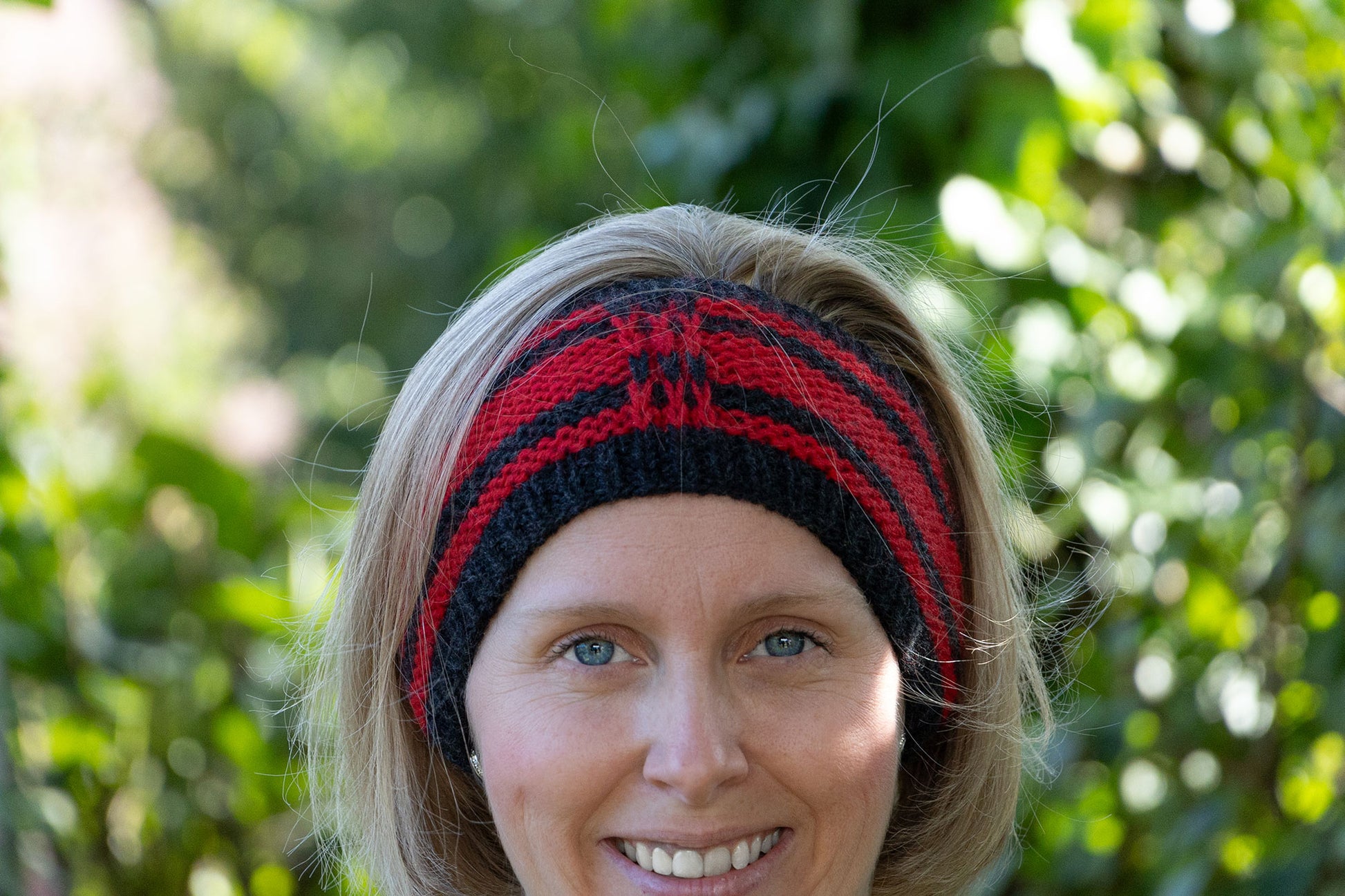 Mit Liebe gestricktes schwarz-rotes Stirnband.